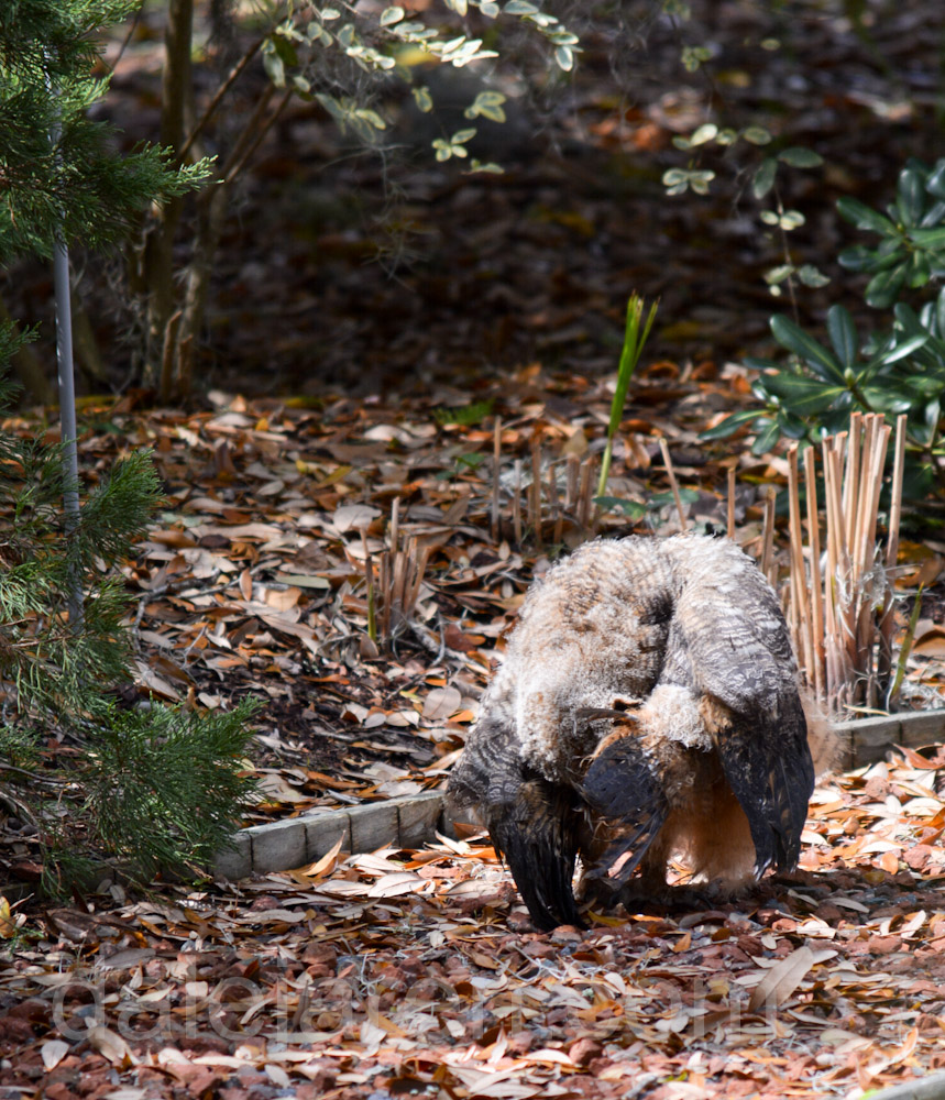 Last year about this same time, we had juvenile Great Horned Owls show up in our garden. We called them the ‘Twins’. They were the size of the owlet we have now in our area. They sat side by side, everyday, quiet and well behaved. Until feeding time.