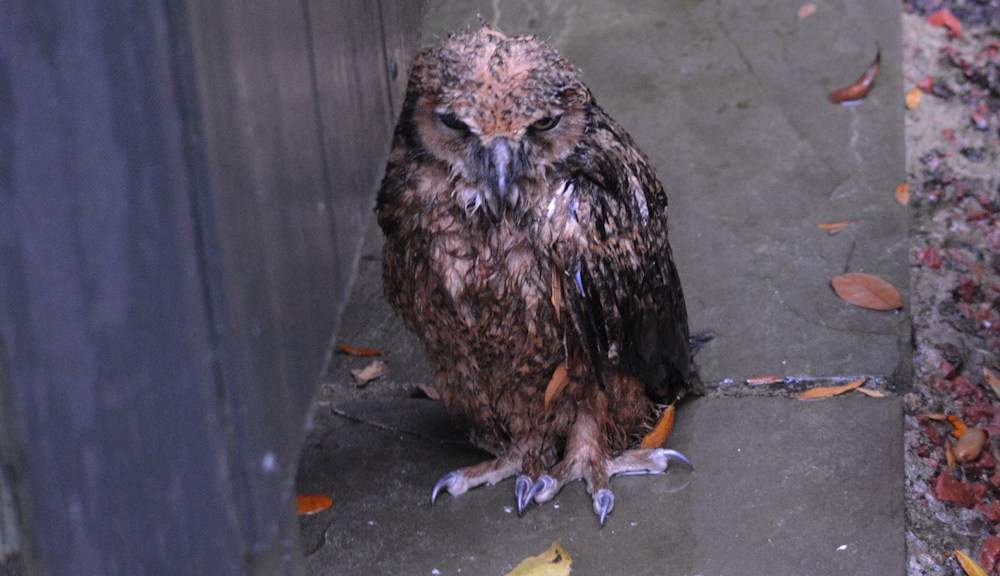So it is about 11 PM on Thursday night and my two neighbors and I are out there with flashlights checking on MiniMe. There it is, just sitting next to the pond looking innocent. Obviously the climbing lesson was not successful. What is it with this owl? Now it wants to be a duck?