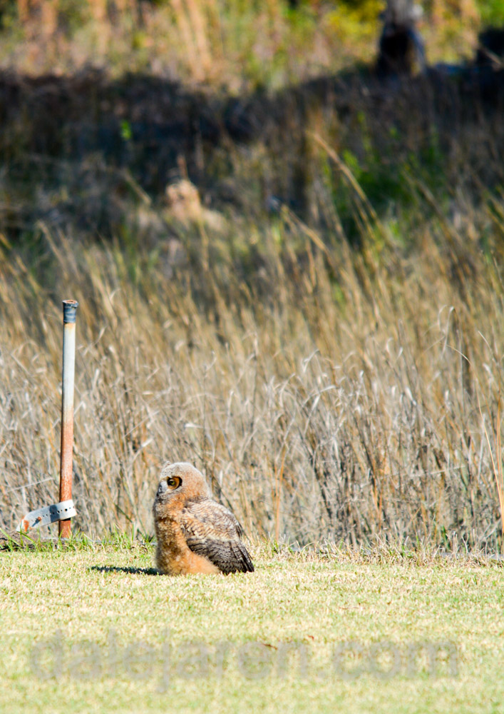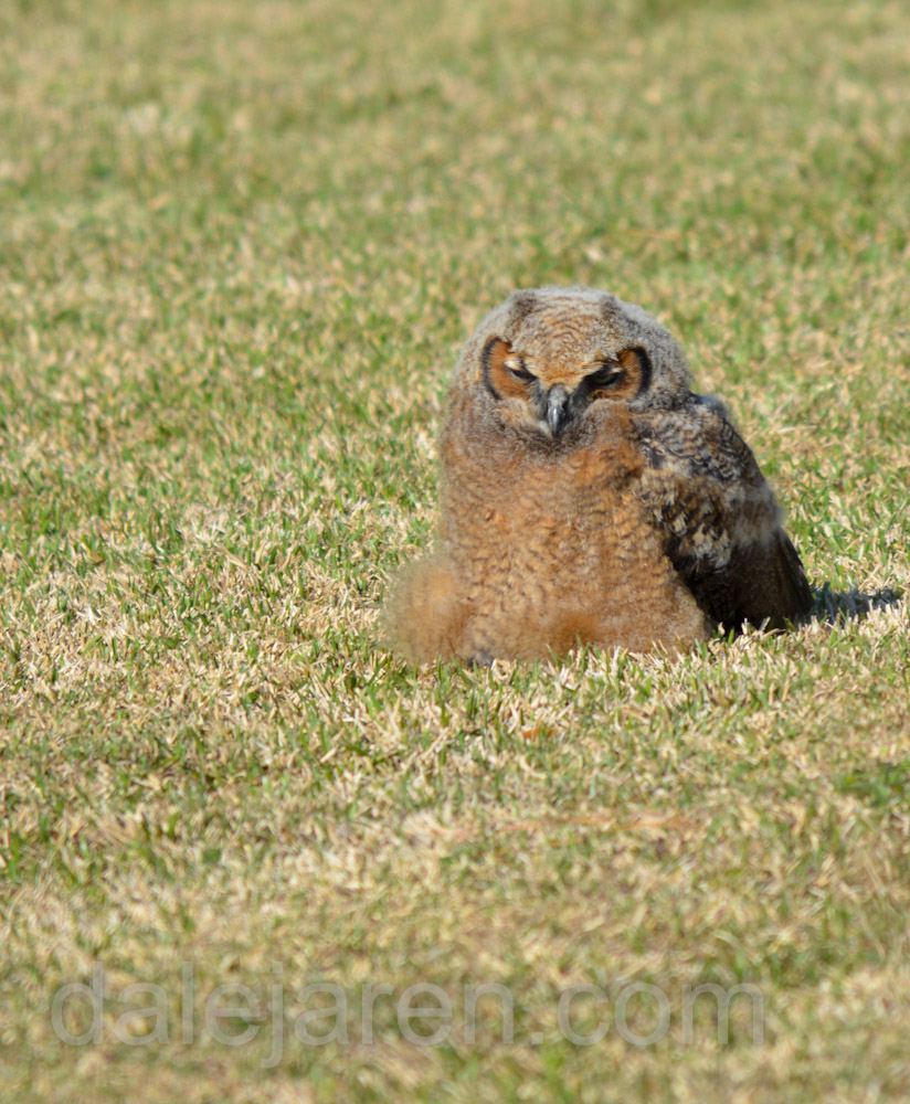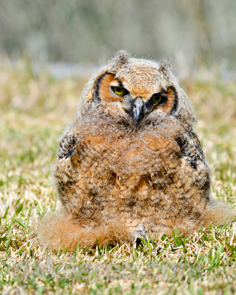 Sure enough. A Great Horned Owlet is just sitting there next to a pine tree, out in the open, in total and complete site!