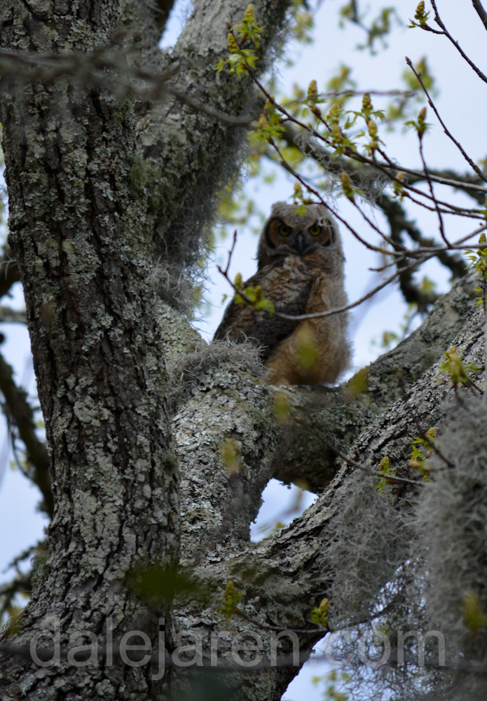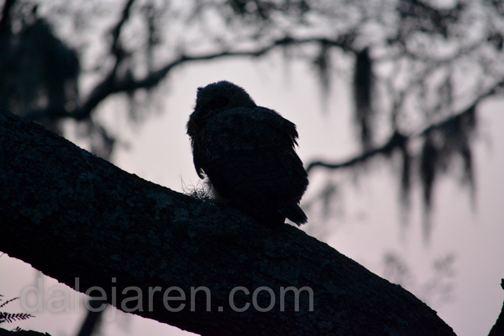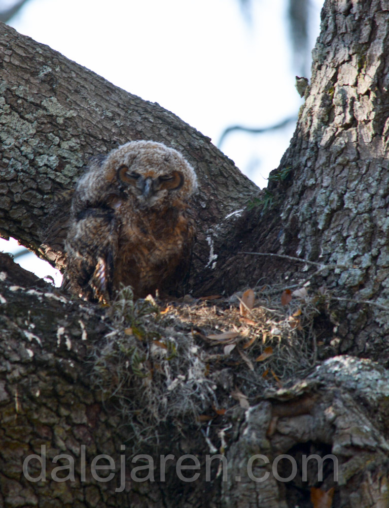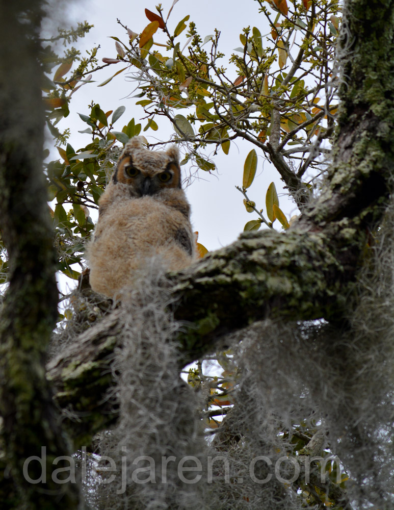 Saturday morning, I am up at dawn. Do I hear two owlets squawking or only one? They are ventriloquists. If there are two, they are close together. I cannot see through the trees and Spanish moss in the early light. There is insistent squawking. I want to believe it is MiniMe. The much more vocal of the two. But I cannot verify.