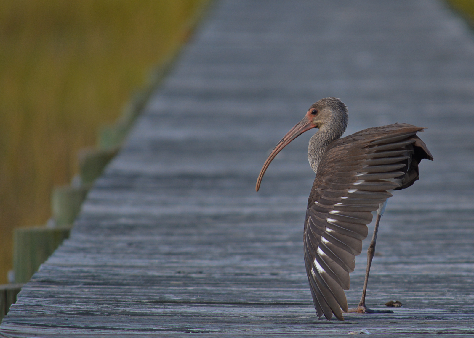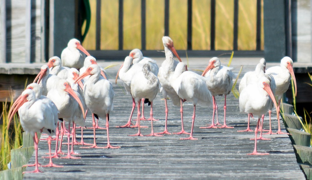 There is a lot going on this fall in our garden and on the marsh. We have seen flocks of White Ibis grazing the marsh for fiddlers crabs. Below is a juvenile hanging out on our dock showing off its beak and wing feathers.