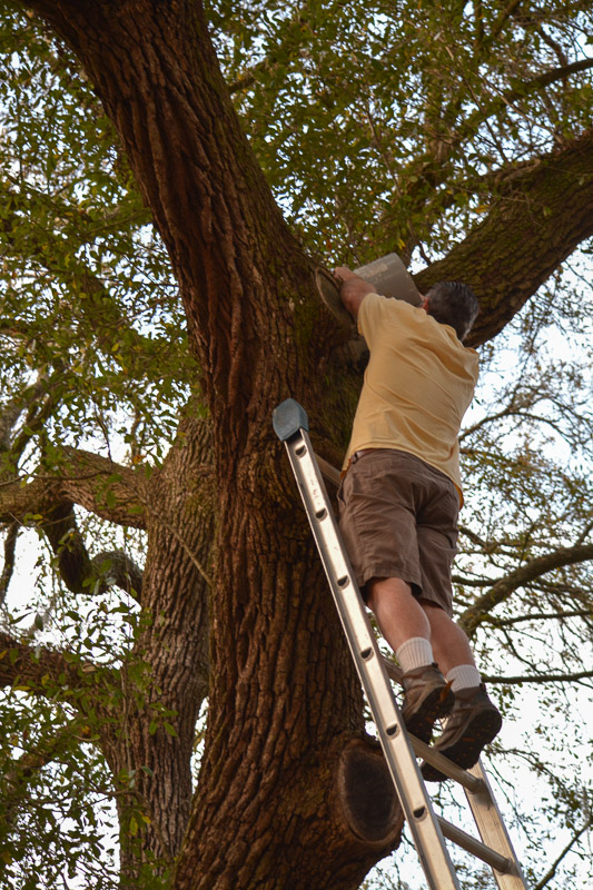 Scott and I decide to place it in a large Live Oak Tree. We get permission from the homeowner. We put the chick in a bucket, Scott sets up the ladder to reach a crotch (or nook) in the tree, about 20 feet high. We discovered last year that a bucket was the most expedient and safest way to carry a chick up a ladder – for all involved. I explain to neighbors that have gathered to watch what and why we are doing this and also what to expect. And give everyone our contact information.