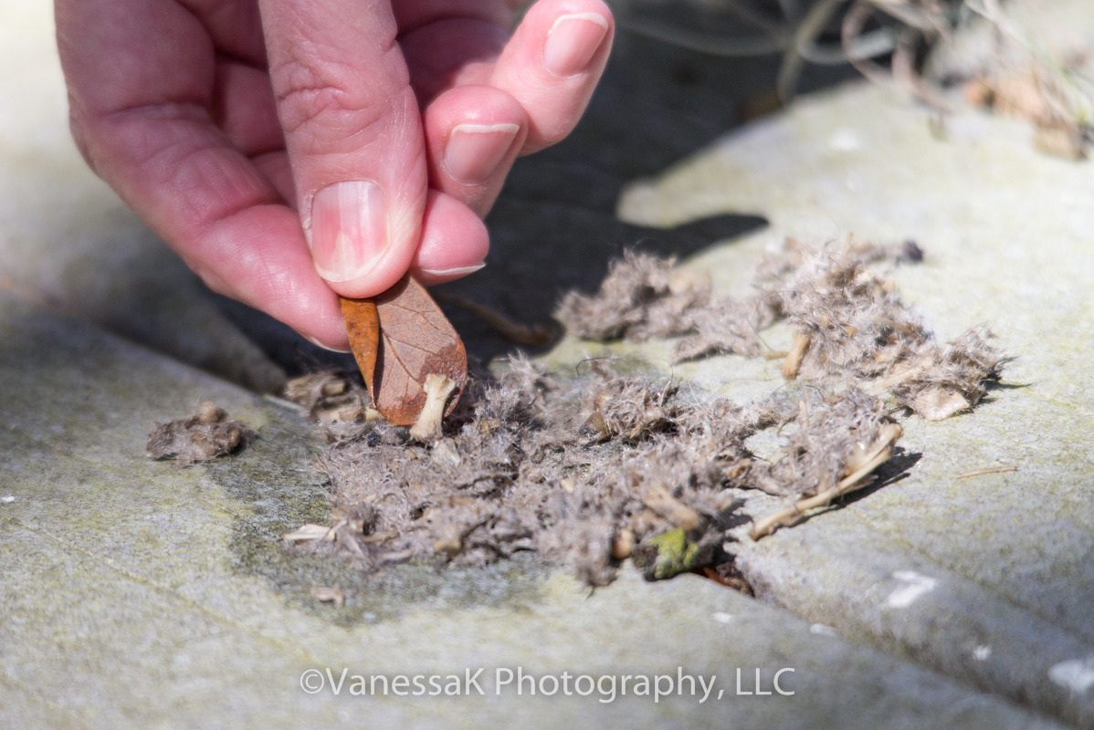We also explored the area under a parent’s favorite perch and discovered an owl pellet. Vanessa took this shot of me investigating its contents of bones and fur.