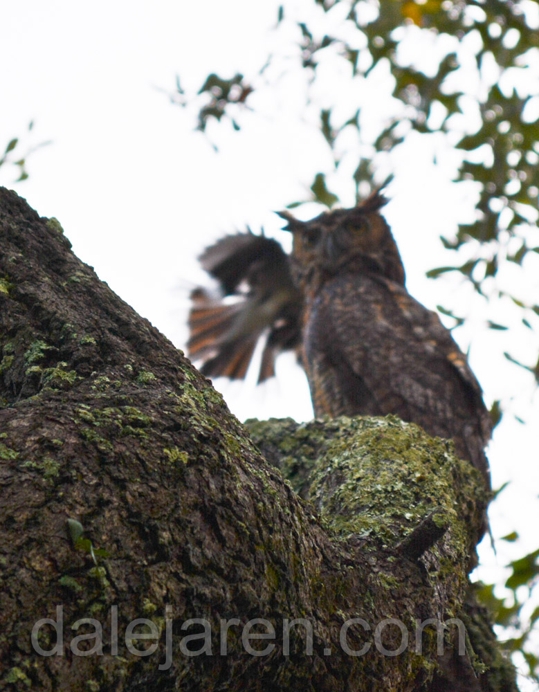 Below is not a great quality photo BUT it is pretty interesting. It was early morning, very low light. I found out where one of the parents was on watch because it was getting mobbed by other birds. There were crows screaming and dive bombing the adult owl. But I do not know what bird this is in the photo flying above the owl. I did not know I caught the shot until processing. If you know, tell us!