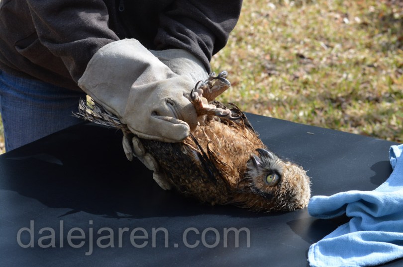 Mar 20 MM examination March 21, 2014 1000 × 665 Going , going, …not quite gone…. Debbie demonstrates how to hold the owlet for examination