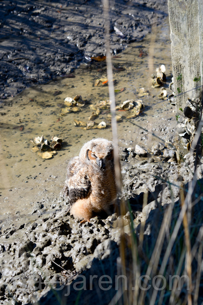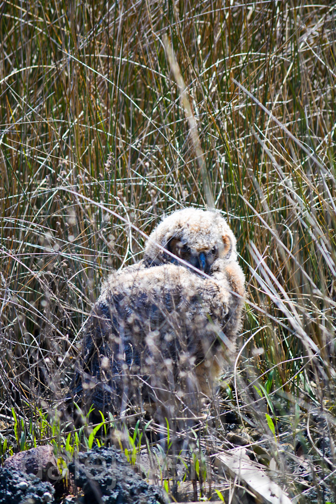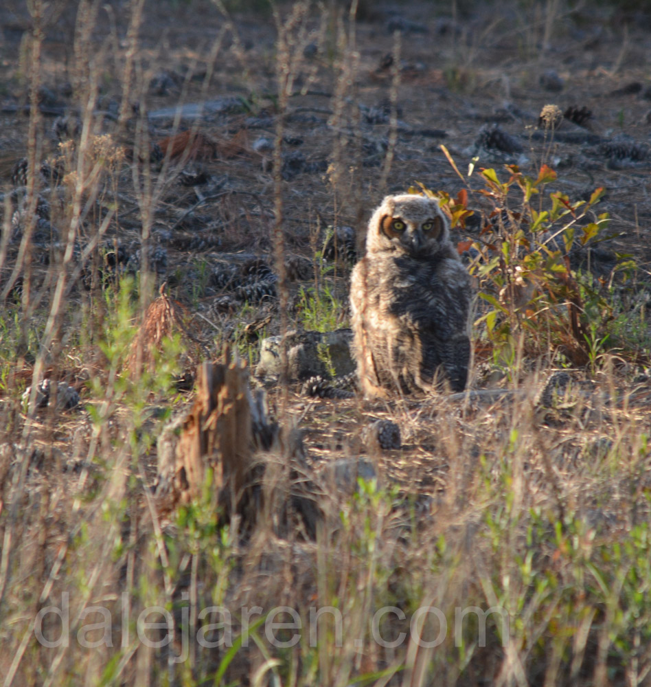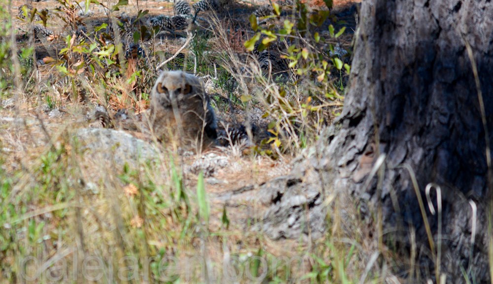 Sure enough. A Great Horned Owlet is just sitting there next to a pine tree, out in the open, in total and complete site!