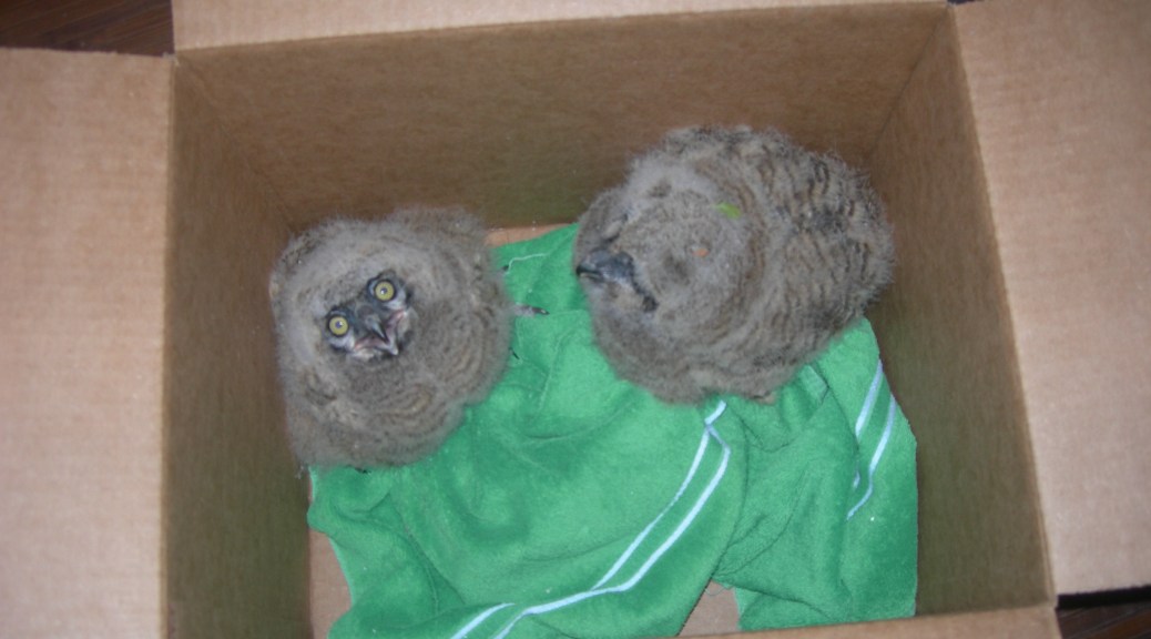 I go get the box (again!) for the grounded owlet. It seems to quiet them down when in the cardboard box with the flaps closed. This is also the protocol for injured birds to keep them safe.