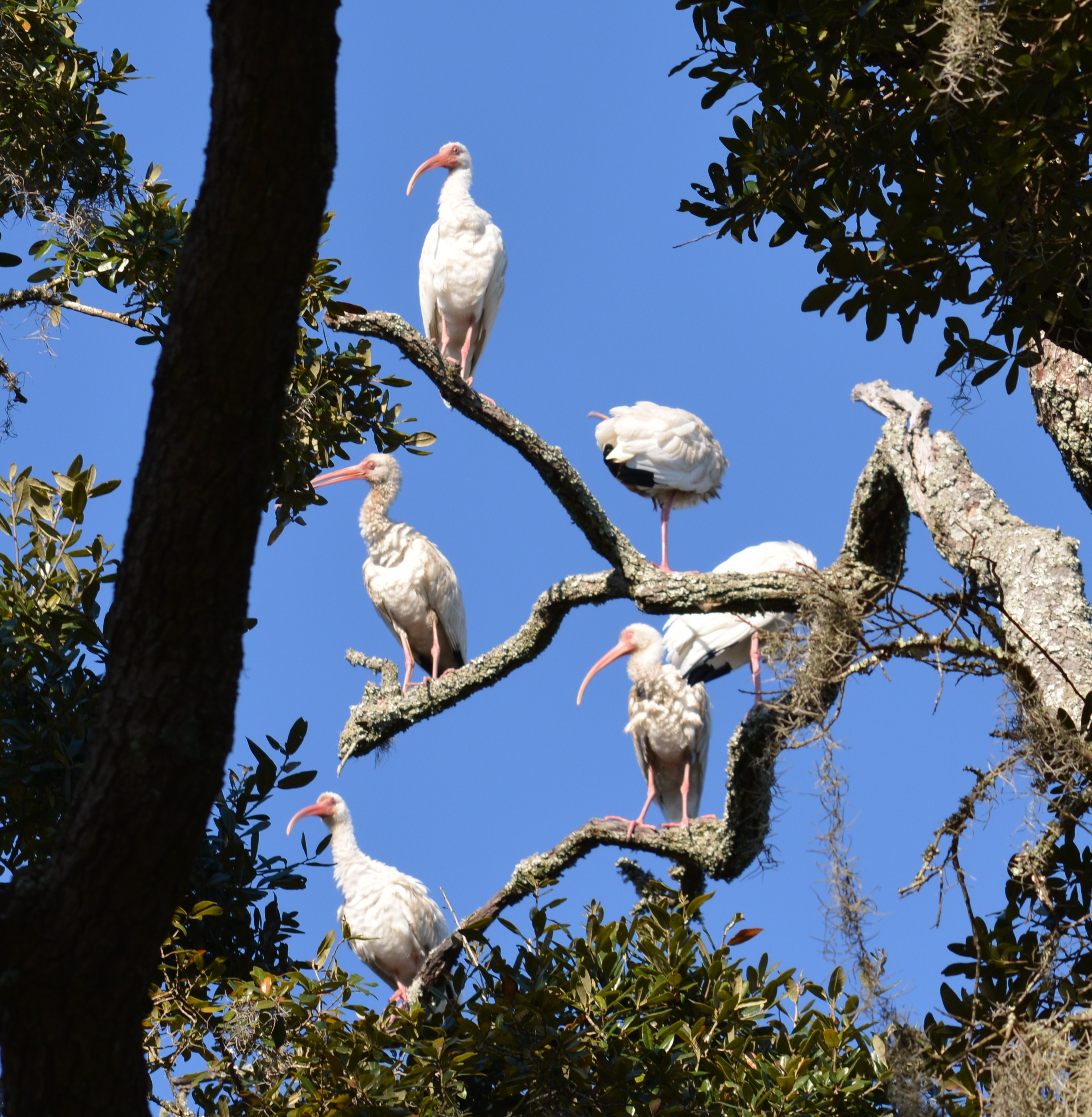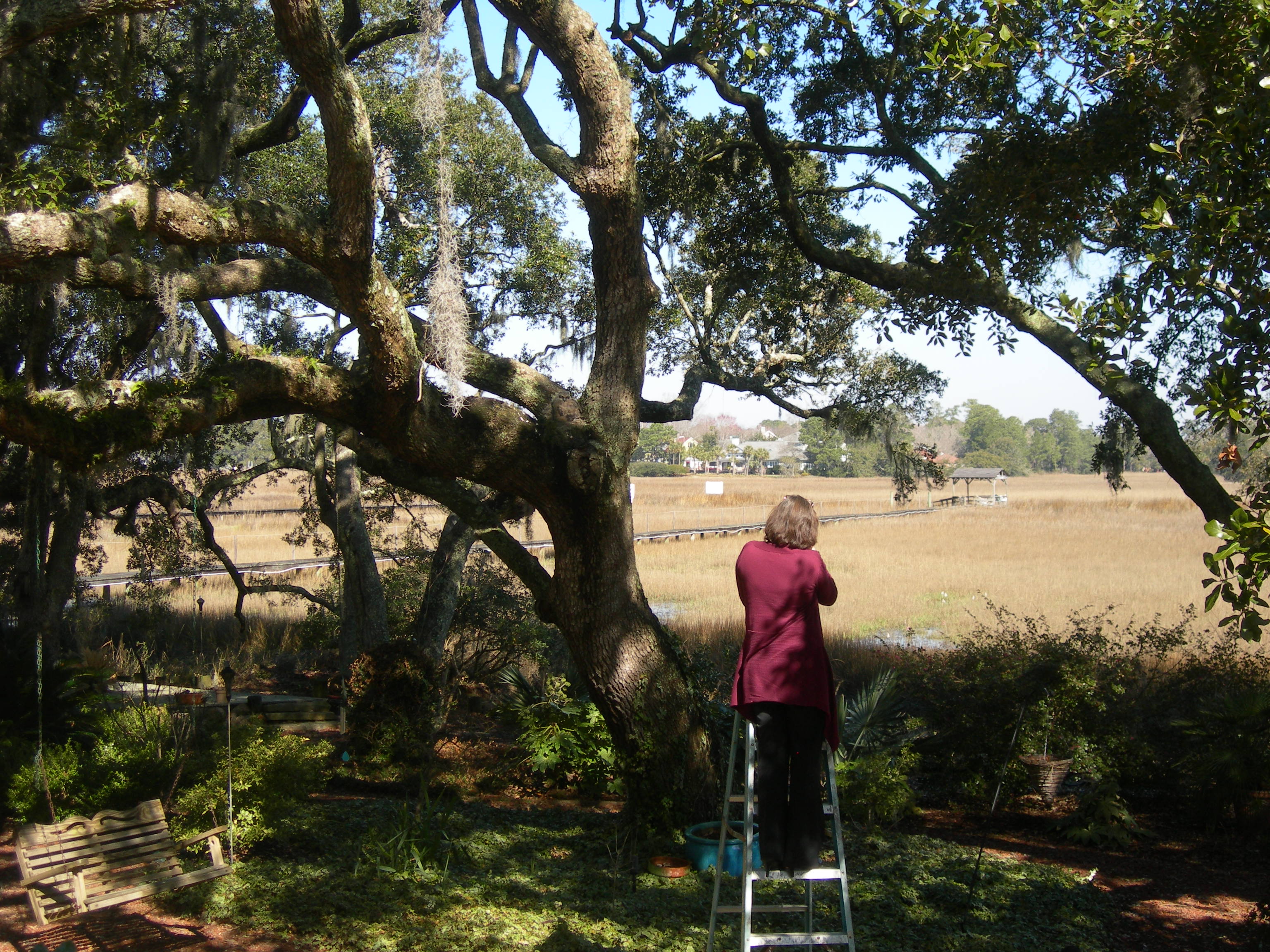 Scott and I decide to place it in a large Live Oak Tree. We get permission from the homeowner. We put the chick in a bucket, Scott sets up the ladder to reach a crotch (or nook) in the tree, about 20 feet high. We discovered last year that a bucket was the most expedient and safest way to carry a chick up a ladder – for all involved. I explain to neighbors that have gathered to watch what and why we are doing this and also what to expect. And give everyone our contact information.
