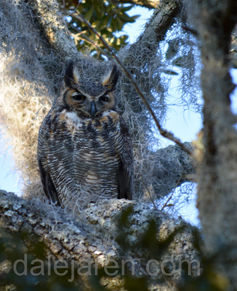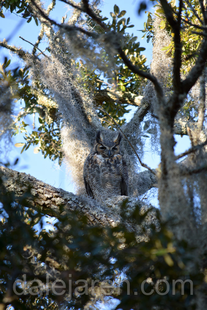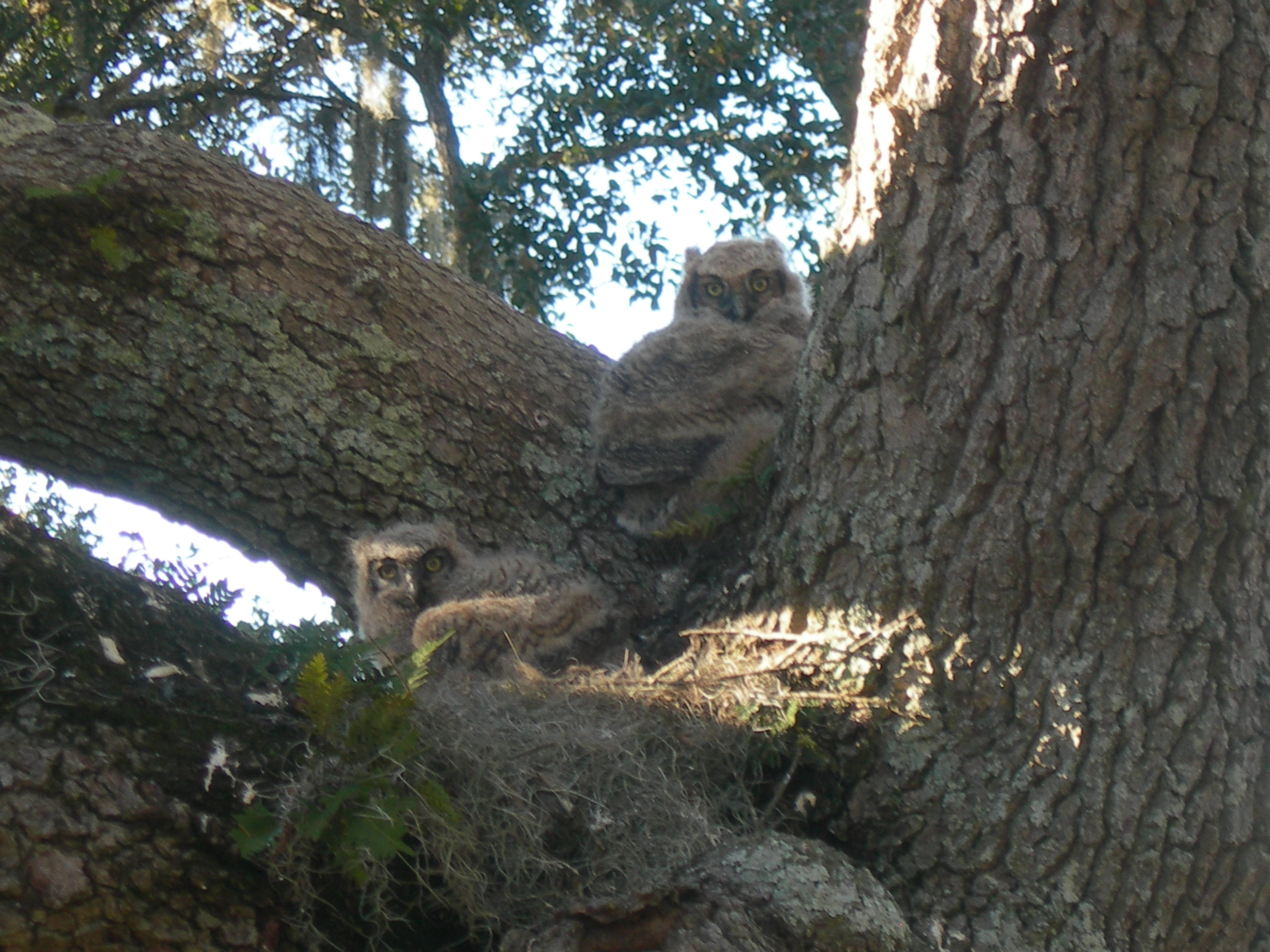 Sure enough. A Great Horned Owlet is just sitting there next to a pine tree, out in the open, in total and complete site!